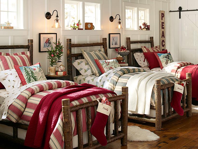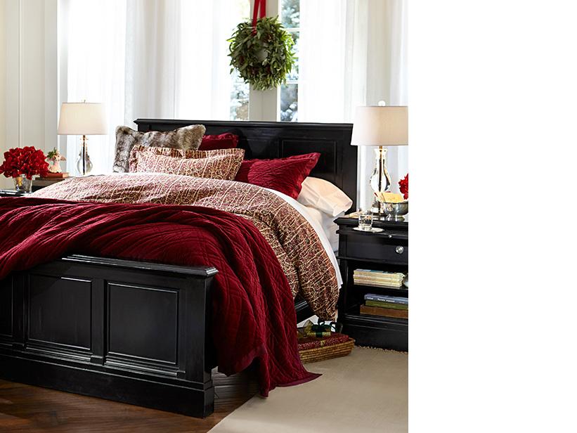 Here, a bold combination of red and black is soft and embracing. Front and center, a black mahogany bed and matching nightstands give the room great presence and a sense of enclosure. The textures of the red bedding respond to both natural and lamp light. Glass lamps, an ivory rug, white drapes and sheets deepen the richness of the room’s saturated hues while adding light and graceful character.