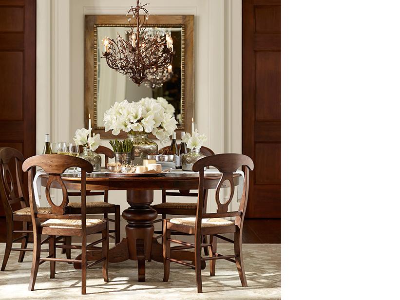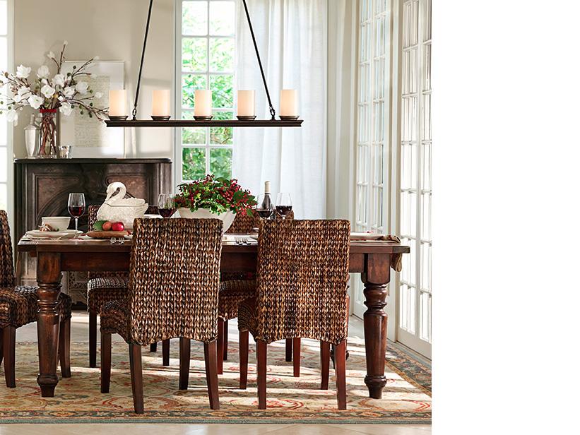 Although formality is no longer required in a dining room, this one proves that mealtimes can still be a special experience. To create that sense of easy festivity, the dining table is decorated with flowers, candlelight and silvery serving pieces. Chairs with woven seats create an air of informality. Above, a fanciful chandelier adds a polish and lights the space, and the mirror behind it doubles the glow.