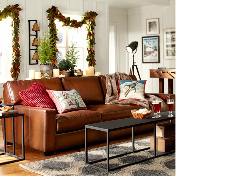 Layered with special items, this classic space has been made truly unique. A leather sofa is warmed with a silky faux fur throw and festive pillows that express a personal passion for skiing. Underfoot, the rug softens the occasional tables’ strong lines. A spotlight lamp, shiny octagonal objects and wall art made of golden bells set a good example of creating a stylish room using unusual accessories, mixed and matched.