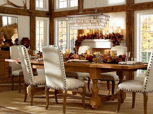 Long before Thanksgiving dinner is served, this room makes a welcoming first impression. A gorgeous table gives year-round rewards as the center of family meals and center stage for fall’s favorite repast. Antique-style chairs add big personality, tempered by the mantel’s bright candlescape and harvest garland. The sisal rug is charming in its simplicity, having laid a natural groundwork for the room’s grand furnishings.