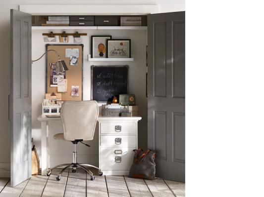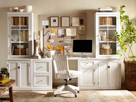 Stationed in a family living room, this space is a happy haven for at-home work. A suite of stylish pieces are combined for an amazing amount of storage and workspace, and painted white, they always seem sunlit. Every must-have is here: a slim, space-saving lamp, a soft rug and a swivel chair that tucks under the desk. Above, inspired mementos and reminders add the best kind of finishing touch: one that is whimsical and personal.