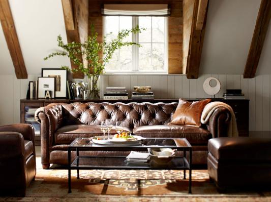 Throughout this cozy room, a mix of soft textures and bold shapes give it a sense of fluidity and movement. Leather furniture seems even more soft offset by an angular glass coffee table, crisp beadboard walls and a wool rug woven into an abstract pattern. The walls’ slim lines relate to the linear shapes of the photography, objects and books on display, which energize this restful room.