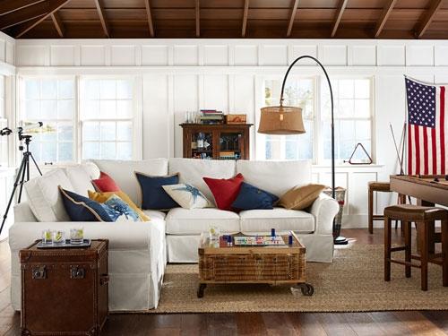 Nothing makes a room look better than unified color. Here, three main colors – red, white and blue – are made even more vibrant by natural accents. The white sofa is dressed with both primary- and neutral-color pillows. A pool table defines the space as welcoming and fun. Subtly, the room is given a truly finished look by keeping many of the books, accessories and other little touches within the all-American color scheme.