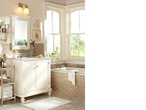 This bathroom’s white and ivory theme is warm and relaxing, and gives it a cohesive look that visually expands the space. A stack of towels on a gleaming étagère create a disciplined motif that’s repeated throughout the bath, from the mirror and a trio of photographs hung vertically, to the two-tiered shelf and the thick trim of tile. This room is clean, crisp and soothing – perfect for a bathroom.