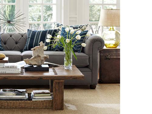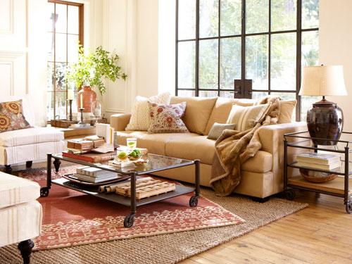 Flooring often has the greatest influence on the look and feel of a room, especially when two different rugs are layered. A nubby natural-fiber rug underneath a woven dhurrie highlights the room’s play on pattern: intricately embroidered pillows, a soft faux fur throw and a mix of compelling objects, from books to candlesticks complete the scene. The result is a lively and welcoming room, from the ground up.