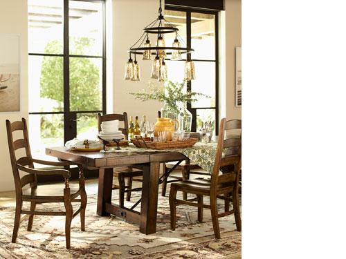 This room feels warm and familiar, with a substantial dining table, coordinating chairs and patterned rug underfoot. It departs from the expected with the whimsical chandelier above, and the room’s subtle mix of shapes and patterns seen in the ladderback chairs and floral table linen details. Windows left unadorned frame the space and offer plenty of natural light.