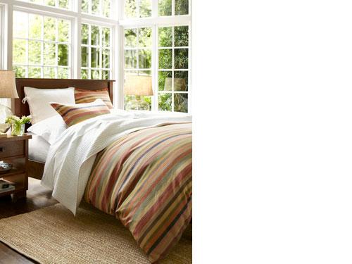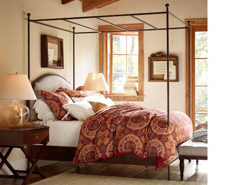 Harmoniously arranged from corner to corner, this room features an undressed canopy, which makes the entire space seem breezy and light. Airy cotton sheeting reflects sunlight by day and enhances lamplight at night. A few touches – crocheted trim on the pillowcases, favorite books and shadowboxes filled with mementos – form a thoughtfully arranged, but relaxed space. A jute rug completes the picture.