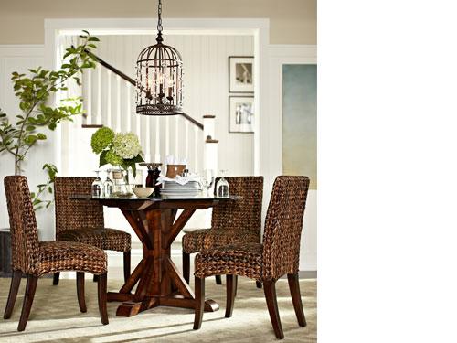 An intimate dining space is great for hosting small and even larger gatherings. Here, a round table makes it possible to seat up to six; a glass top is reflective and makes the table seem bigger. Textural seagrass chairs add visual depth and are also incredibly comfortable. The birdcage chandelier expresses the room’s theme: contained and harmonious, with beautiful furnishings that allow it to sing.
