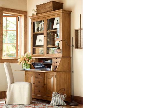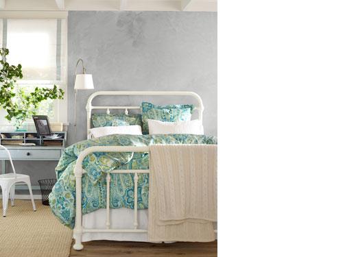 A graceful iron bed is the focal point here, where a mix of great furnishings and creative wall paint make this guestroom feel as important as the master bedroom. Every aspect of the room is thought out, from the desk for quick work sessions, to the layers of bedding for guests who need a little extra warmth. A rug completes the room, not just to warm bare feet, but to give the room a sense of defined spaciousness.