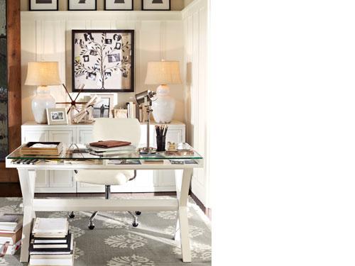 In this very personal small home office, black, white and gray are used to stunning yet subtle effect. A glass-topped desk takes up most of the room, but because it’s painted white, it seems to disappear against the white walls and pale gray rug. The upholstered chair is undeniably stylish, but comfortable. Photos and personal objects abound, each with a personal story that adds meaning to the most mundane of tasks.