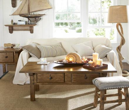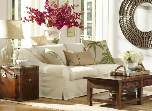 With a few simple updates, it’s easy to refresh your space for summer. Here, we used accents like palm tree pillows and flowering bougainvillea to infuse a light-filled living room with the spirit of the tropics. The sofa’s sloping roll arms encourage lounging, and a side table modeled on a steamer trunk adds character to the space. A vintage-style tree grate creates an eye-catching focal point on the wall.