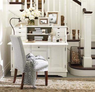 If you don’t have room for a home office, all you need is a hardworking desk and a few accessories to transform a compact nook into a well-appointed workspace. Our desk’s fold-down front makes it easy to tackle daily tasks – and to tuck away clutter when you’re done. Adding beautiful objects – favorite photos in elegant frames, an antique-style lamp and fresh flowers – makes the space instantly inspiring.