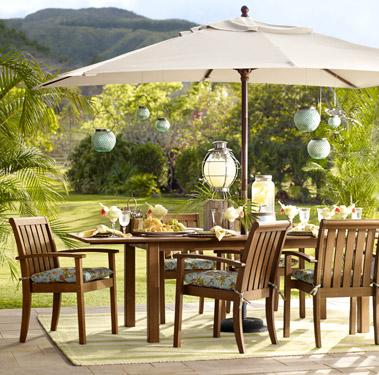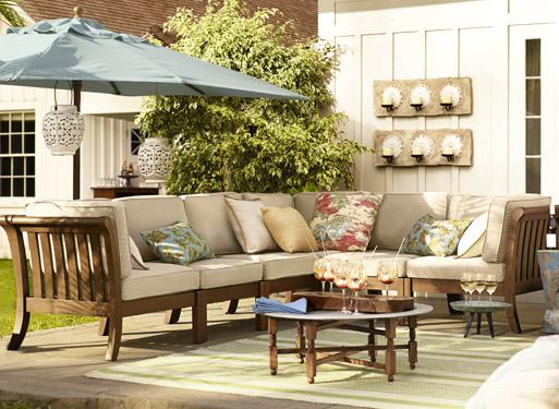 In an outdoor living area, antique-inspired silhouettes paired with sun-dappled cushions all around are an invitation to stay awhile. The solid mahogany sectional and aluminum-surfaced coffee table set the framework, while lighting with heirloom character adds a warm glow throughout. A generously sized umbrella, green-striped rug and side tables with the appeal of found objects complete this summer destination.