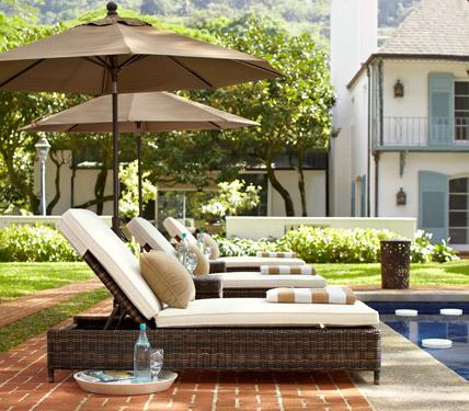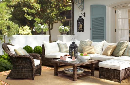 Fashioned to withstand the elements, this wicker seating collection has the casual framework and plush cushioning that’s just as comfortable as an indoor sectional. A natural-fiber rug complements the sofa’s woven texture. Artful pillows placed alongside a few in decorative stripes play on the home’s soothing blue backdrop. Hand-stamped iron lanterns lend old-world character and cozy up the area.