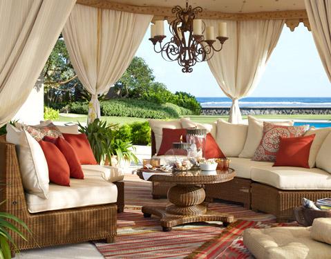 We’re firm believers that great outdoor spaces deserve as much care and attention to detail as their indoor counterparts, and this artfully designed lounge area is case in point. The handwoven furnishings cleverly marry classic silhouettes with weatherproof materials, laying an inviting foundation. Eclectic accents like lushly layered rugs, glass oil lamps and a dramatic chandelier instantly warm up the space.
