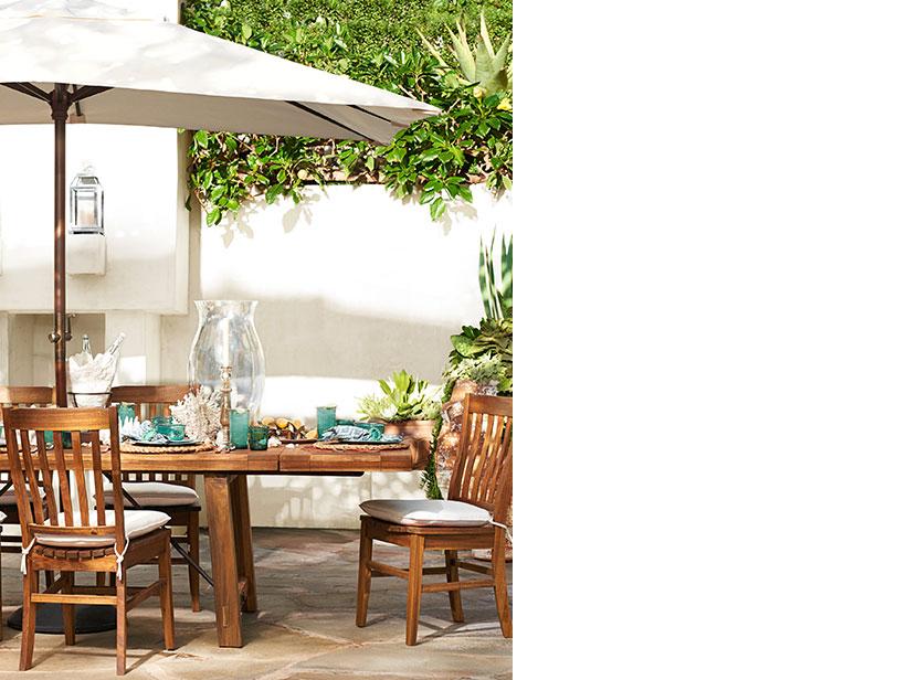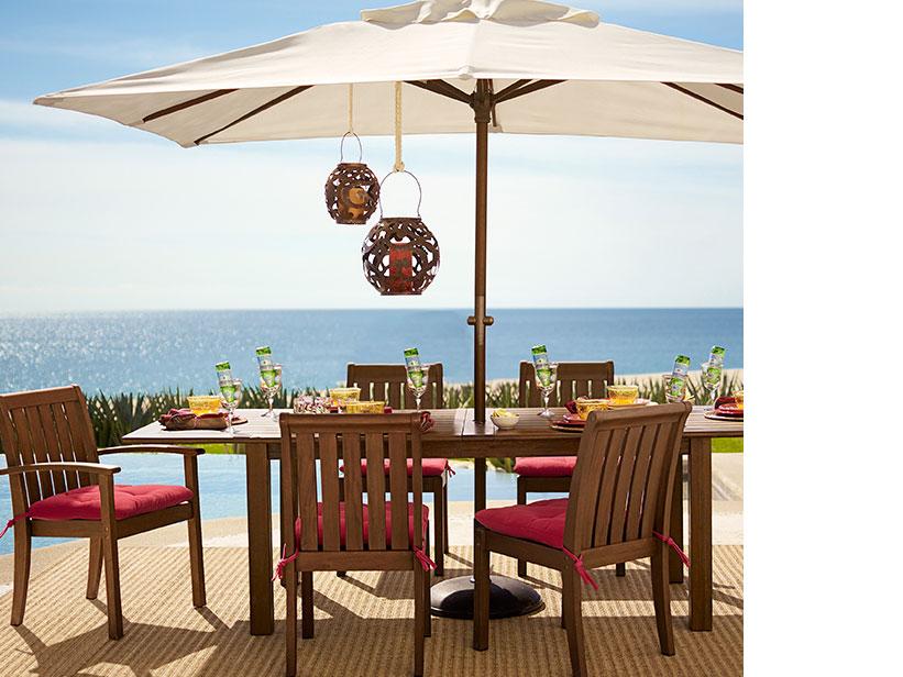 Artful touches of summer-rich color make this outdoor dining space a natural for festive meals. Red, gold and honey-stained wood are the common themes. The carved lanterns are the focal point, and the eye then notices the slats of the chairs, which echo the striped motif of the rug—the perfect visual cascade. The final result looks irresistibly effortless.