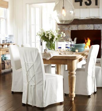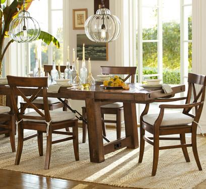 A dining room decorated with this much care and originality puts guests at ease. The strong, angular design of our industrial-style table and X-shaped dining chairs makes a bold statement that’s perfectly balanced by the rest of the room. Muted colors and soft silhouettes – pale-blue walls, blown-glass pendants and an earthy jute rug – lend a sense of calm that’s enhanced by all the space’s natural light.