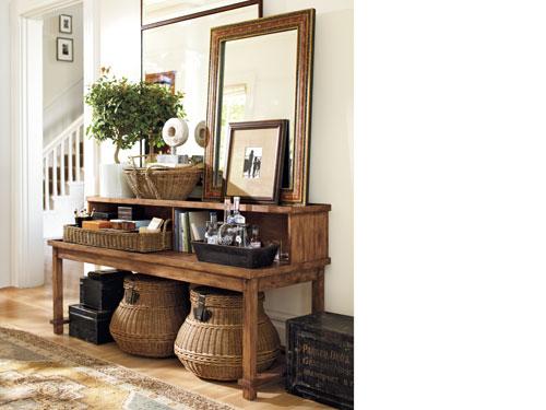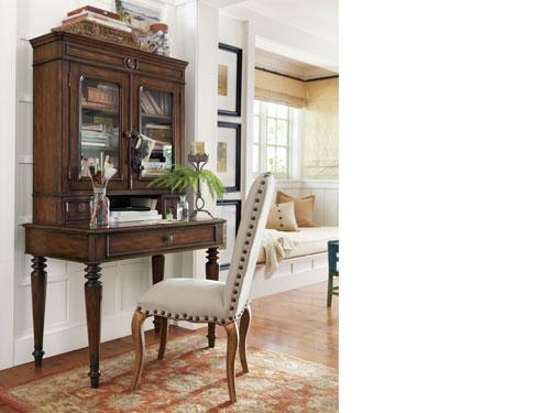 If you don’t quite have room for a dedicated home office, creating a work zone in the bedroom is a great option. Here, a beautiful rug artfully defines the office nook. We’ve chosen a desk with slim lines to maximize the compact area, and topped it with a substantial hutch for artfully storing papers and supplies. Displaying artwork and accessories overhead plays into the space’s vertical arrangement.
