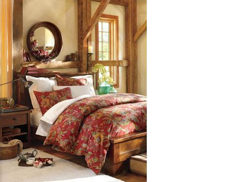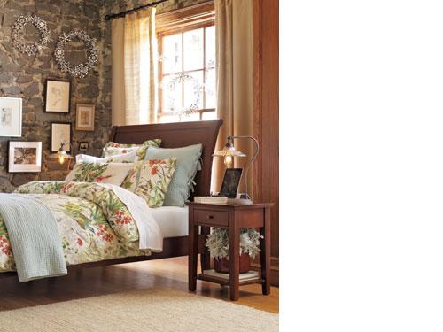 This bedroom perfectly harmonizes rustic elements with a refined sensibility. The key is pairing an eclectic mix of textures while keeping the palette fresh and simple – details like exuberant bedding are met warmly by richly finished furnishings and a thick woven rug. A dramatic mirror displayed overhead draws the eye upward, and surrounding it with accents like books and fresh botanicals breaks up the bold look.