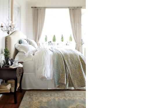 Choosing a simple palette of soft neutral tones gives you creative license to bring a variety of textures into a room. This bedroom’s vivid white walls are gently offset by the bed’s softly sloped, thickly padded headboard, and layers of fluffy white bedding lend airiness to the space. A lofty blue quilt adds just enough color, and the side table’s graceful lines and deep finish artfully ground the look.