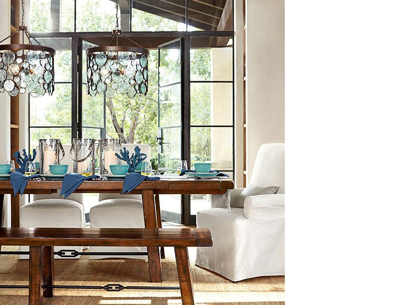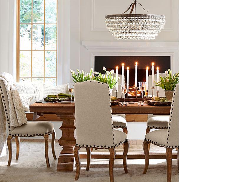 Bright, crisp, elegant and welcoming, this dining room showcases how to balance bold structure with lightness and grace. The grand chandelier draws the eye upward; the rustic metal and curved lines of its frame echo the nail heads and curved backs of the dining chairs. The slender glassware and candle holders offer a striking counterpoint to the table’s strong stature, and the room is soften by fresh flowers and flickering flames.
