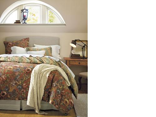 A mix of expertly crafted furnishings and accessories in warm, neutral hues keeps this bedroom relaxing and rejuvenating. Placing the bed directly underneath an eave window takes advantage of the room’s generous natural light while adding grand presence to the bed. A thickly padded headboard makes a comfortable spot for nighttime reading, and a pivoting desk lamp placed near the bed doubles as bedside lighting.