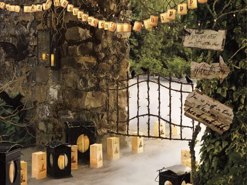 In a scene inspired by the Washington Irving’s Legend of Sleepy Hollow, this entry sets the stage for a spine-tingling Halloween. Black lanterns and caged crow luminaries light the way, letting visitors know that something spooky is underfoot. Handmade signs hint at the horrors ahead, and glossy black crows perch on a sparkling twig gate in an ominous omen of what’s to come.