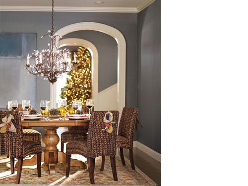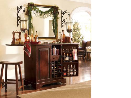 When guests arrive, the doors of this compact cabinet open to reveal a fully outfitted bar. Stocked with barware, ice and spirits, it’s sure to be the heart of every party. Two wall-mounted hurricanes flank the bar for added drama, and the gilt-finished mirror between them reflects the light they cast for a brilliant effect. A garland with a sparkling message puts the finishing touch on the space.