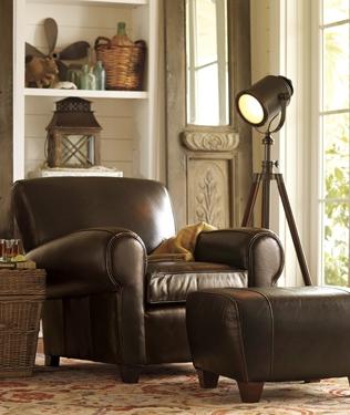 Our leather Manhattan chair and ottoman’s dramatic presence are perfect for defining a small space or creating a private nook in a larger space. The photographer’s lamp is an unexpected interpretation of the traditional reading lamp; details like this help make a room one you’ll love living in. The rug underneath, with its ancient designs and motifs, helps to subdue noise and gives the room a finished look.
