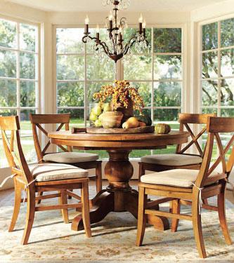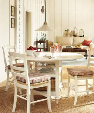 Flexible design is the key to creating a dining space in the kitchen, typically the hardest-working room in the home. Here, a table with built-in shelves provides a handy spot to store table linens and dishes – or baskets filled with newspaper and recycling. Its leaves drop down easily to minimize its size when not in use. A round jute rug defines the dining space, and striped seat cushions add comfort and color.