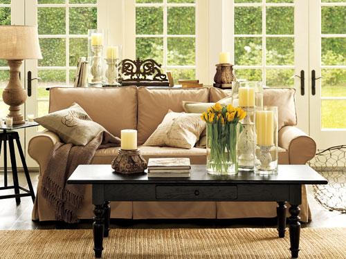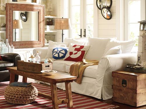 Red, white and blue, plus a striped rug lend this room its decidedly nautical feel. While the look here is definitely casual, a certain pleasing symmetry prevails thanks to the matching finishes on the bench and side table, and the sea-faring accessories. The careful placement of personal objects throughout keeps the look here timeless and collected.