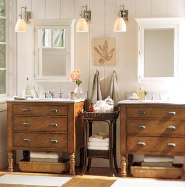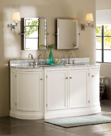 In this bath, warm golden hues pair with creamy whites to create an atmosphere that’s relaxed yet rejuvenating. Topped with beautiful Carrara marble, this console enhances the wall color’s soft appeal while adding crisp contrast. The white-finished medicine cabinets and a coordinated selection of wall sconces lend a streamlined look. Natural-fiber accessories and a simple vase balance the space perfectly.