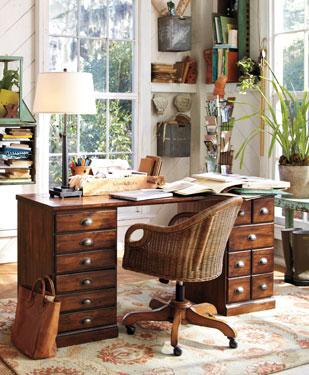 Pairing objects with masterfully crafted designs gives this home office a look that’s at once rustic and refined. Inspired by a vintage printer’s cabinet with dozens of drawers for storing type, the versatile modular desk set grounds the room with its warm Tuscan finish. Richly distressed wall hangings and a showcase of postcards and snapshots displayed in a photo carousel add plenty of character to the space.