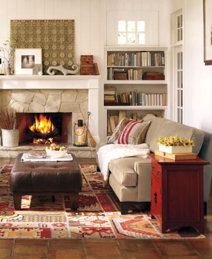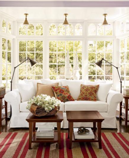In this sunny space, contrast is key. A red-striped rug stands out in bold relief against white walls and a matching sofa, as do brightly patterned kilim pillows. Two side tables combine to create a versatile coffee table, and help anchor the room's palette with the warmth of wood.