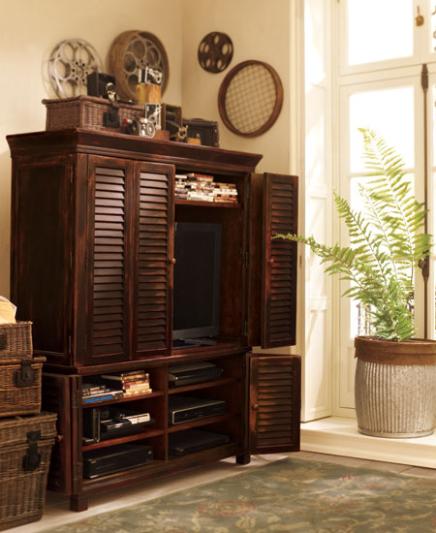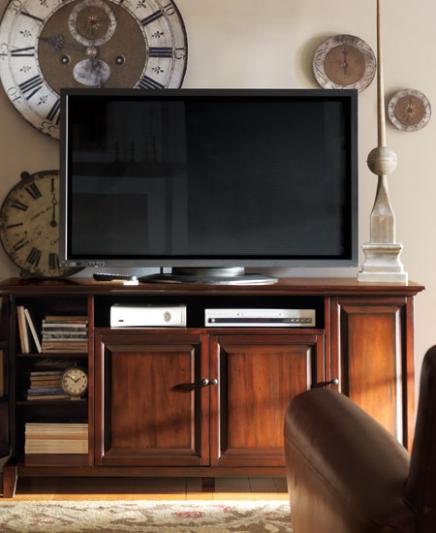 Keeping a media room looking neat and stylish is easy with a console like this one. A mix of open and closed cabinets and shelves lets you display what you like and conceal the rest. The circular vintage clocks contrast the rectangular flat-screen TV for a visually striking display that keeps the space interesting, even when the TV is off.