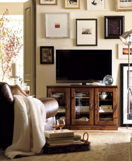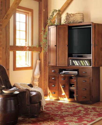 In a space reserved for relaxation, warm honey wood and soft leather set a tranquil tone. When not in use, the TV and other media components can be concealed behind folding doors. Underfoot, the rug's rich red tones and classic floral patterns add warmth and texture.