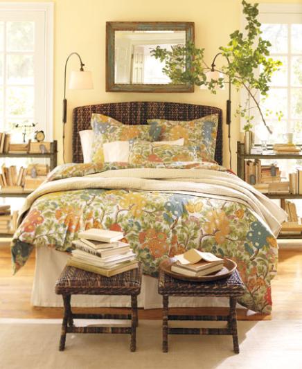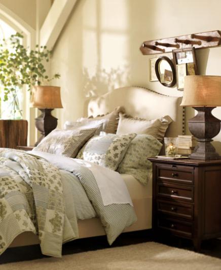 This bedroom's crisp, airy feel comes from its light-colored walls paired with dark wood furniture. A lofty, patterned quilt enhances the lightness of the space, and a leafy plant casts artful shadows, capitalizing on all the natural light. The unique gallery of framed photos suspended from a peg rack brings lots of character to the room.