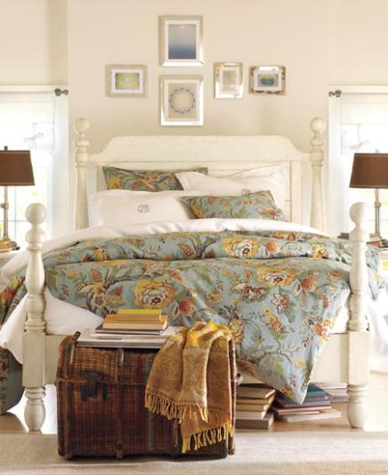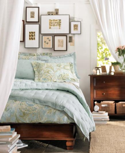 In a compact bedroom, opt for the eye-pleasing simplicity of a restrained palette. By choosing one or two colors and using bedding and accents to weave them through the space, we've created a sense of airiness that defies the room's small size. Grand, sweeping drapes mounted high above the windows further enhance that spacious feel.