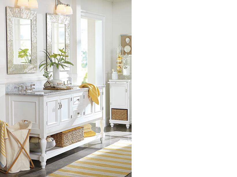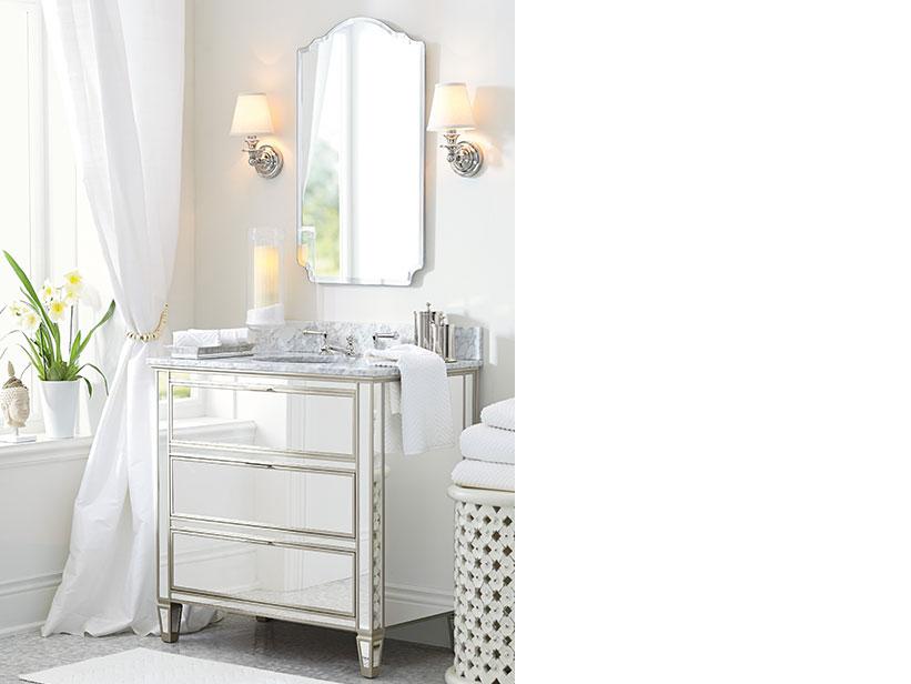 The dramatic style of this mirrored collection transforms the bath into a high-end sanctuary. As in any room, reflective surfaces help emphasize space no matter how big or small the area. Topped with thick Carrara marble, the console embodies a refined look. Polished accessories play with the light. The candle, flowers and drape are soothing, while the hand-carved table on the opposite end makes a sculptural statement.