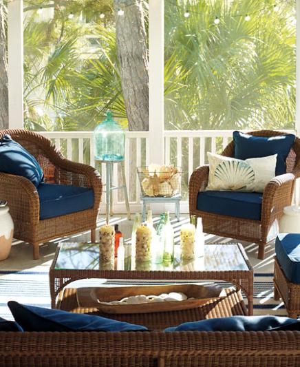 The beauty of a patio is that it's so highly versatile, able to transform from a sunny spot for quiet relaxation to the perfect place for dining and entertaining. Here, we've furnished it with weather–loving wicker–style furnishings, and kept the palette neutral but vibrant with rich blue and honey hues. Washable fabrics, like the cushion covers and pillows, stand up to the elements, but their softness serves as a reminder of a patio's leisurely temperament.