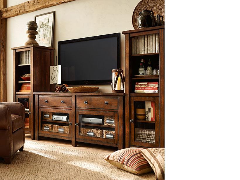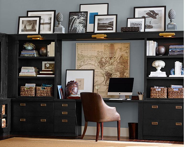 A balance of open and closed storage gives this office suite streamlined yet storied style. An oversized map takes the focus off the computer screen – a smart strategy for rooms that are multi-functional. Books blend in with framed photos and sculpture, giving the space a nice blend of shape and line. A brown leather chair, brass task lighting and a tan sisal rug help to bridge the black and white palette.