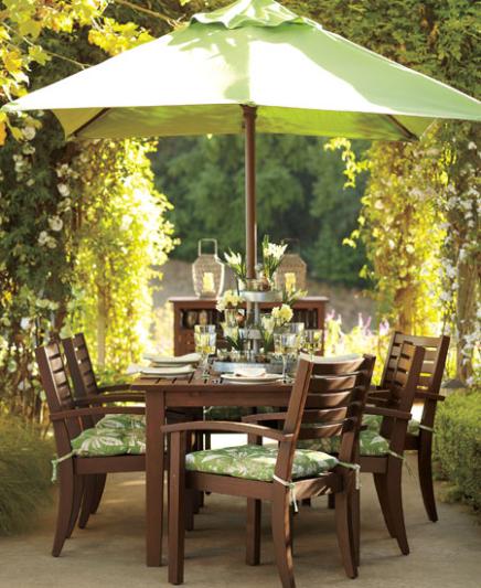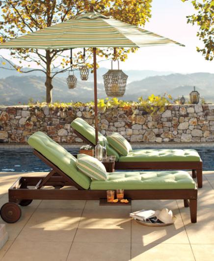 A refreshing green color scheme, carried out in the chaise cushions, the umbrella and the accent pillows, makes this classic summer scene feel especially soothing. The umbrella offers much needed shade on sunny days, and the hanging lanterns provide illumination for evening dips and lounging. The adjustable chaises also lie flat, making them smart extra seating for poolside gatherings.