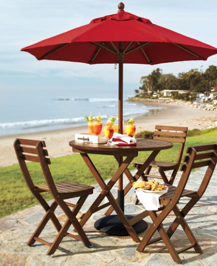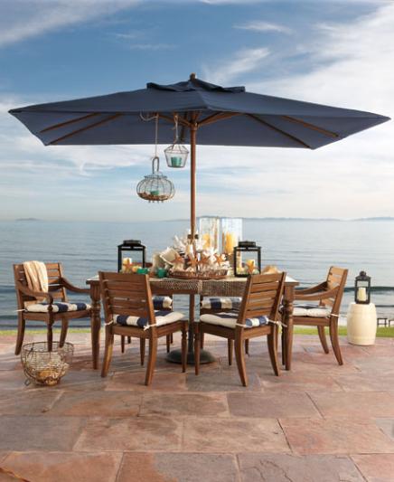 Featuring turned legs, scrolling arms and comfortably sloped seats, our Faraday Collection brings the beautiful details of traditional dining-room furnishings into the great outdoors. An ink-blue umbrella, hanging lanterns and a ocean-inspired centerpiece capture the casual beauty of the shore.