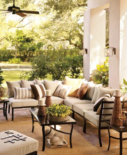 The key to this patio's appeal is in the details – from the rattan candleholders to the diamond-woven rug. The sectional is arranged in an L-shape that's ideal for talking and relaxing. Pillows in a mix of solids and stripes make it all the more inviting.