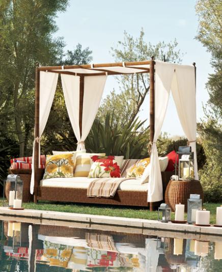 For pure summer indulgence, nothing can match the appeal of an outdoor daybed. This one has fabric panels for privacy and shade and a thick back cushion that lets it function as a sofa or sleep space. Bold floral pillows add tropical style.