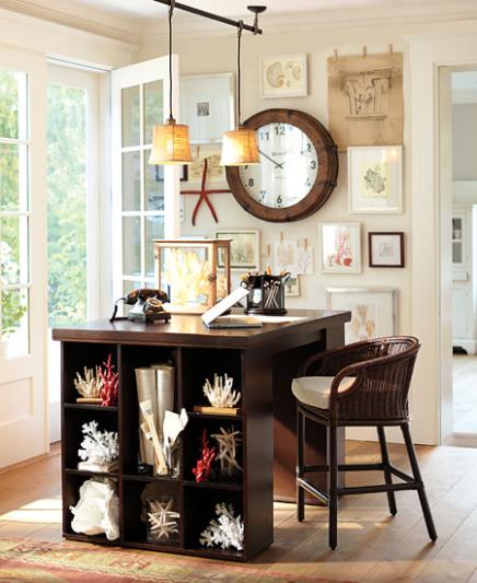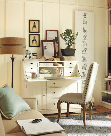 In a compact, versatile space like this one, creating a well–appointed office zone is ideal for being productive. Here, a dramatic wall hanging and a striking floor lamp define the work area, bringing focus to the desk. The desk's thoughtful design maximizes space while keeping papers and supplies hidden behind the fold–down front when it's not in use.