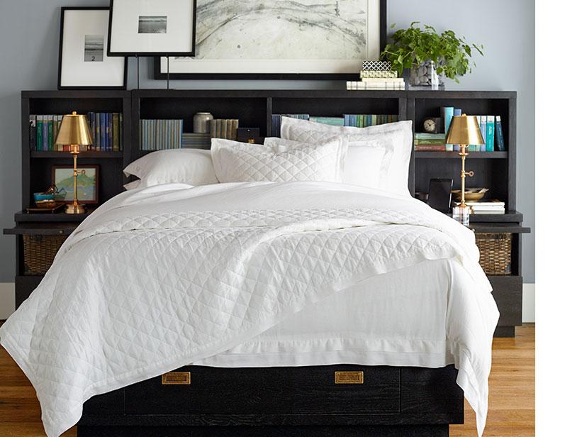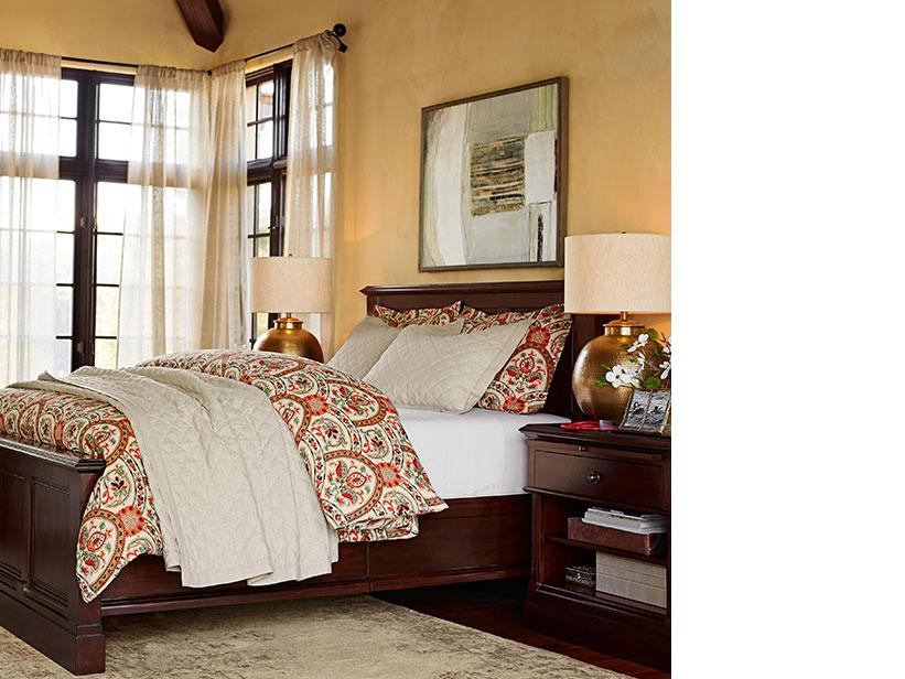 It’s easy to imagine retreating into this warm and stylish bedroom. The heirloom furniture creates a strong and classic presence with its broad crown molding and deep brown finish. Crisp white sheets, a flax quilt and linen window panels add loftiness but also subtle structure, and make the way for highly stylized floral bedding. Brass hammered bedside lamps add a gorgeous shape and glow.