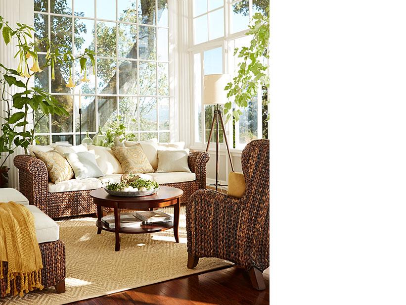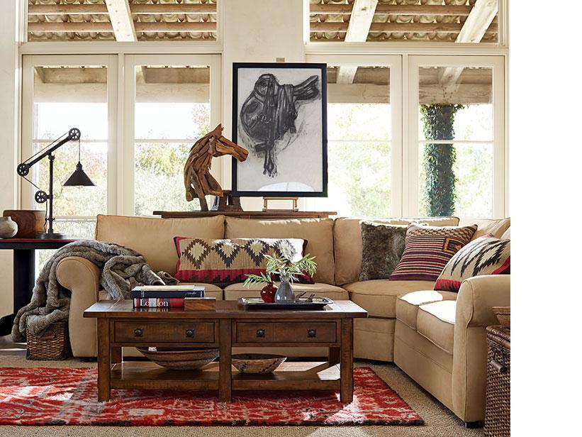 A perfect balance of rugged and refined, this living space is imbued with style and spirit. An overstuffed, spacious couch sets a casual tone and encourages family and friends to gather together. A wood horse sculpture, charcoal saddle art and Kilim throw pillows make for bold design strokes that give the room its distinct western style. Pulley lighting and salvage style tables nod at a romantic, rugged past.