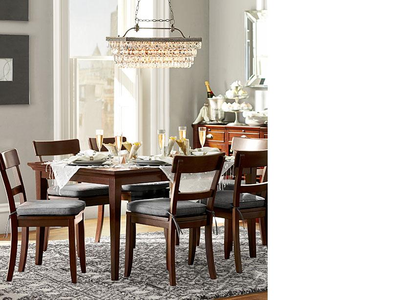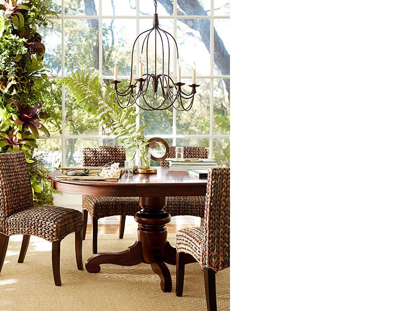 This room is great for dining, entertaining and even working, with its grand, extending pedestal table and stylish, comfortable chairs. Warm, earthy tones in the furniture have a natural charm that’s inviting both in daylight and by candlelight. Unadorned windows keep the look airy, and a lush garden view is extended to the indoors with a dramatic, ceiling length mix of bromeliads, ferns and other leafy plants.