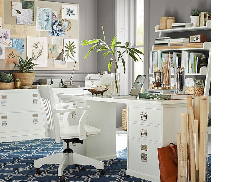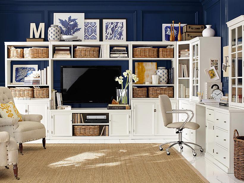 Clean lines and cool color make this multi-purpose room feel organized and alive. The white modular wall system is customized to hold personal essentials – from media and art to office supplies. Indigo art prints mix in shape and pattern, while woven baskets and a seagrass rug add dimension. Edwardian style armchairs encourage settling in and an airgo chair offers stylish support for concentrated tasks.